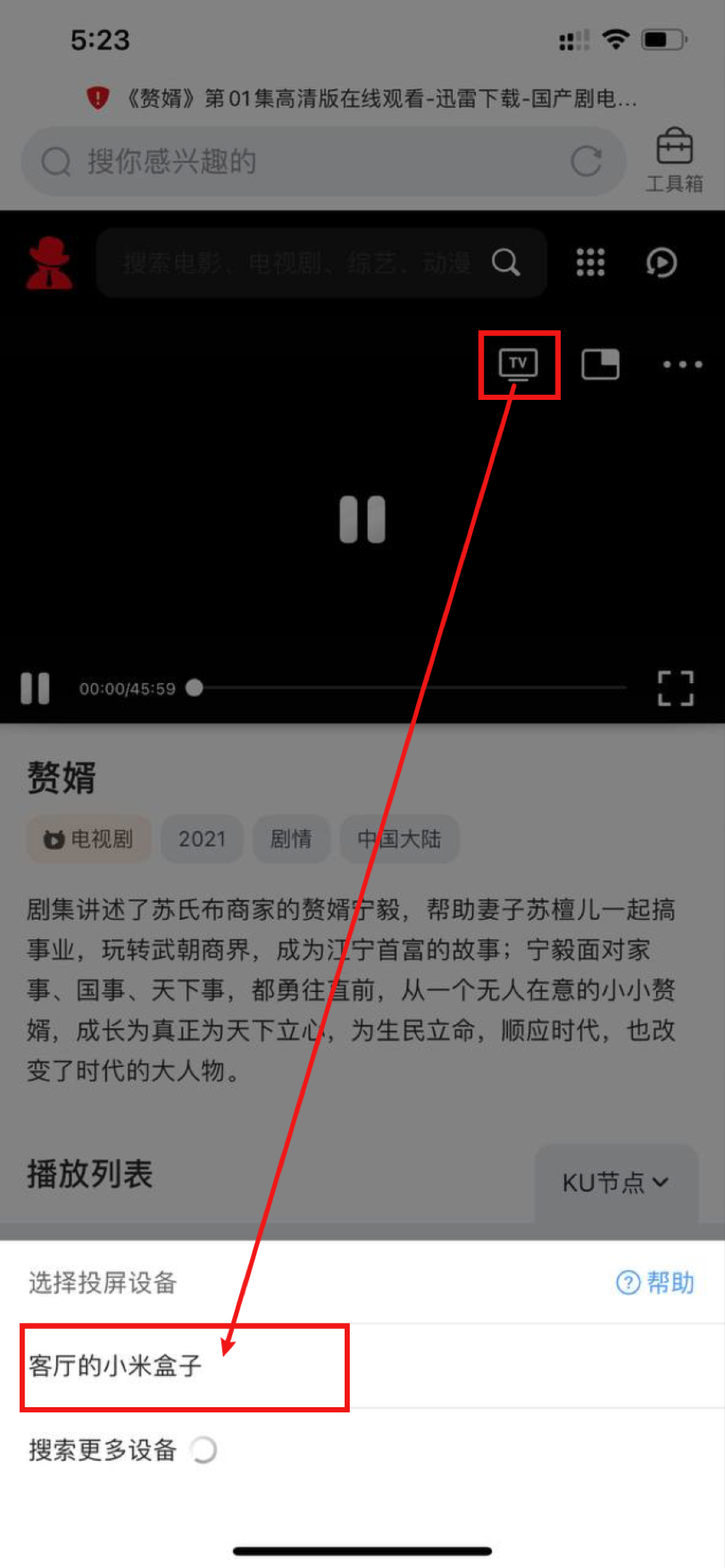 打开QQ浏览器(会接管网页播放器)->打开快插基地->播放视频->选中投屏图标->等待搜寻出智能电视/电视盒子->选中,即可投屏。