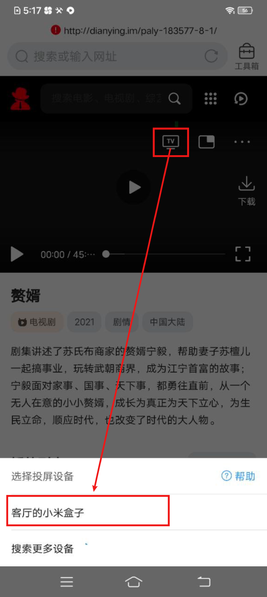 打开安卓UC浏览器->打开快插基地->开始播放->全屏->左下角投屏->等待搜寻到智能电视/电视盒子->选中,即可投屏。